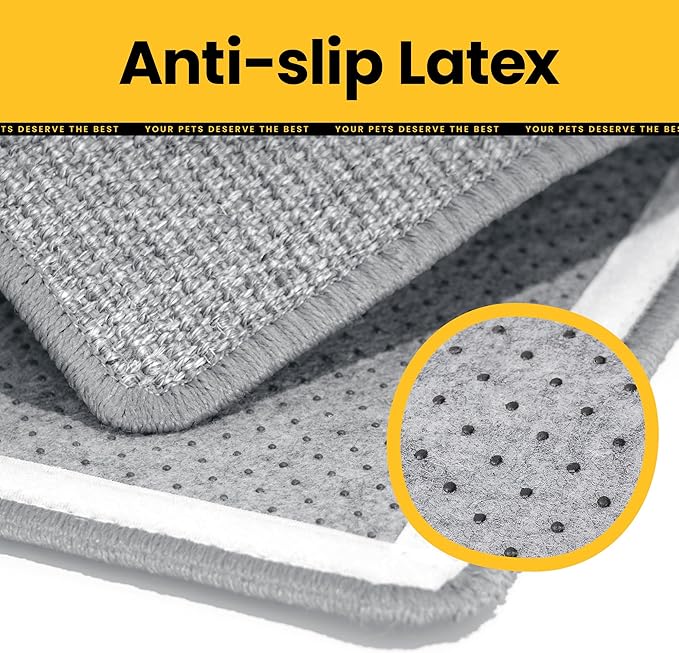 - Unique Anti-slip Design: The backside features anti-skid latex, ensuring the sisal cat carpet scratcher stays firmly in place while your furry friend enjoys scratching. Additionally, four long Velcro tapes allow easy attachment to floors, walls, furniture, or doors, serving as a wall-mounted sisal cat scartacher pad. This design provides a smooth scratching motion, satisfying your cat's natural instincts.