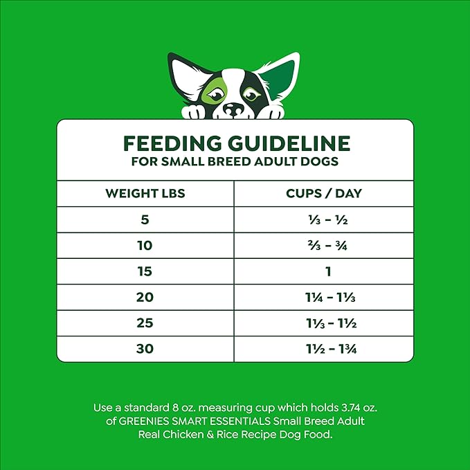 - Contains one (1) 13.5 lb. Bag of Greenies Smart Essentials Small Breed Adult High Protein Dry Dog Food Real Chicken & Rice Recipe.