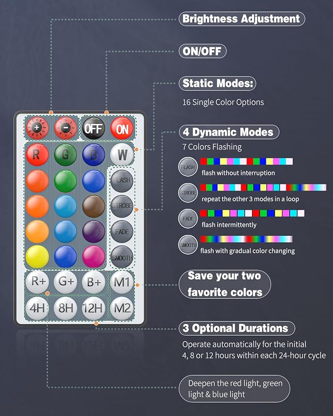- 9 Levels of Brightness: The fish tank background light provides 9 adjustable levels of brightness. Freely adjust the luminance for the growth needs of your fish. (NOTE: It is only adjustable under single-color modes. Not fit for Flash, Strobe, Fade and Smooth.)