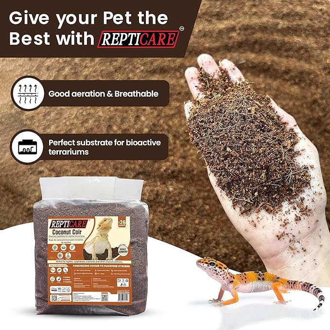 - 36 Quarts Coco Coir Bag: ReptiCare Coco Coir offers ready-to-use 36 quarts of pure, organic coconut fiber, creating a natural and comfortable environment for your reptiles. Perfect for bioactive terrariums, it supports the health and happiness of species like ball pythons, boas, snakes, tortoises, geckos, frogs, tarantulas, and more, mimicking their natural habitats for optimal well-being