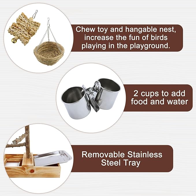 - Multi-Functional Bird Supplies: Bird toys playground completes with hanging decoration and hanging bird nests, providing endless opportunities for birds to explore. And included 2 stainless steel cups can be used to place food and water. Size: 12.9*9.2*14.5in.