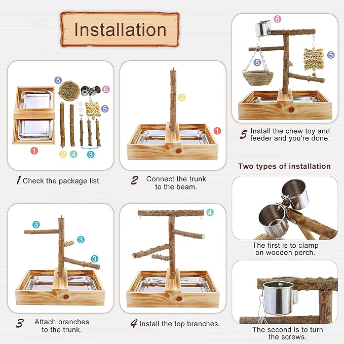 - Humanized Design: There are two ways to install stainless steel cups. You can choose it you think is the most stable. 1. Install the stainless steel water cup on the clip with the screws and then clamp it on the bird perch stand. 2. Screw the stainless steel water cup into the top branch with the provided screws.