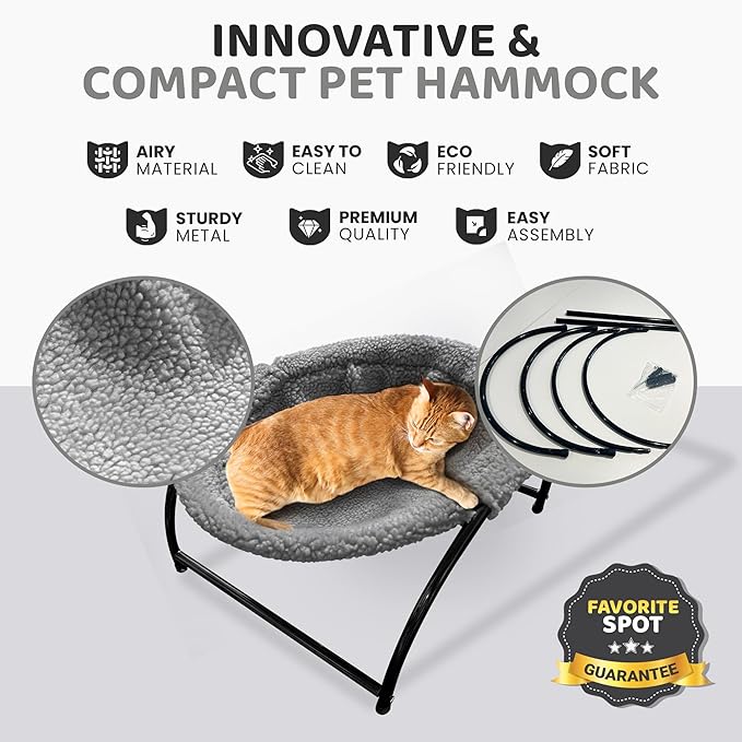 - Special Feature : Easy to Clean - Our cat hammock is made with a durable metal base and a soft fuzzy cotton bedding. The metal base can be easily wiped down to clean and the cotton bedding is machine washable. We recommend air drying the bedding., Strong and Durable - Once assembled, our cat hammock is designed to be very durable with the normal everyday use of your cat., Easy to Assemble - All instructions and tools are included and assembly is fast and easy., Comfy and Cozy - We know your cat will love our cat hammock and it will become a favorite spot for your cat to relax and snooze. We offer our FAVORITE SOPT GUARANTEE to all our customers. If you for any reason are not satisfied with our product, simply return it to Amazon and we will refund your money., Lightweight - Our cat hammock is durable, yet compact and lightweight. It can be easily moved around your home to ensure your pets comfort. Easy to Clean - Our cat hammock is made with a durable metal base and a soft fuzzy cotton bedding. The metal base can be easily wiped do… See more