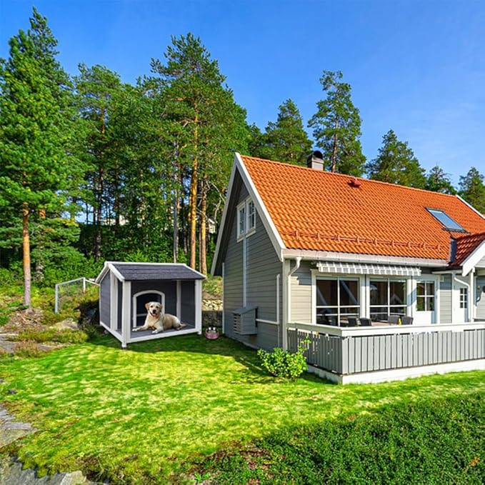 - Waterproof & Ventilation: The outdoor dog house has a 0-gaps sloping roof that effectively preventing water from seeping through and keeping dog kennel dry in rainy weather. It is also designed with raised feet and a bottom plate with gaps, which is ventilated, breathable, and moisture-proof, ensuring that the interior of the dog house is free of mold. This house provides a healthy and comfortable living space for your furry friends.