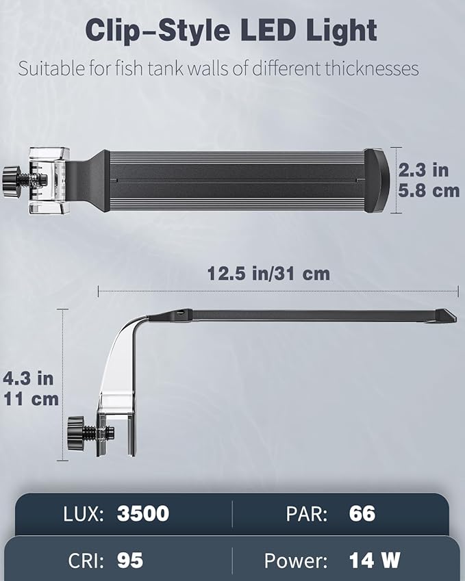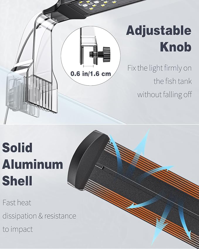 - Heavy-duty Design: The clear board of the aquarium light is strictly sealed with silicone to keep out moisture or droplets. Solid aluminum shell can accelerate heat dissipation. The long-lasting bulbs and ETL-certified adapter ensure safety and continuous lighting.