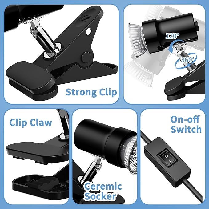 - 【360 Degree Rotating Clip】The reptile lamp fixture can be rotated 360° in any direction.The holder with clamp design, you can clip it on or hang it up. Can be tightly cliped on edge of table and other device in pet house.