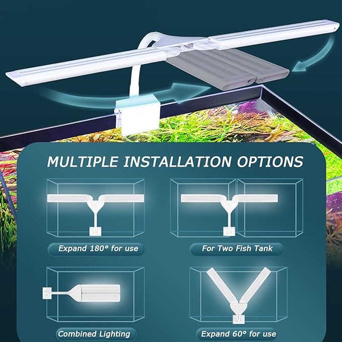 - 360° Flexible Neck & 2 Light Bars for 2 Tanks : This aquarium led light have a soft arm, so you can aim it where you want and move it out of the way to clean / water changes the tank.