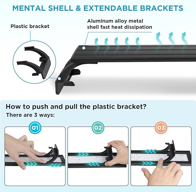 - [ Adjustable Brackets ] the fish tank light comes with 1 pair of plastic mounting brackets, which is freely extendable. You can easily to install this led fish tank light on most aquarium tanks, with cover or no, with rims or rimless