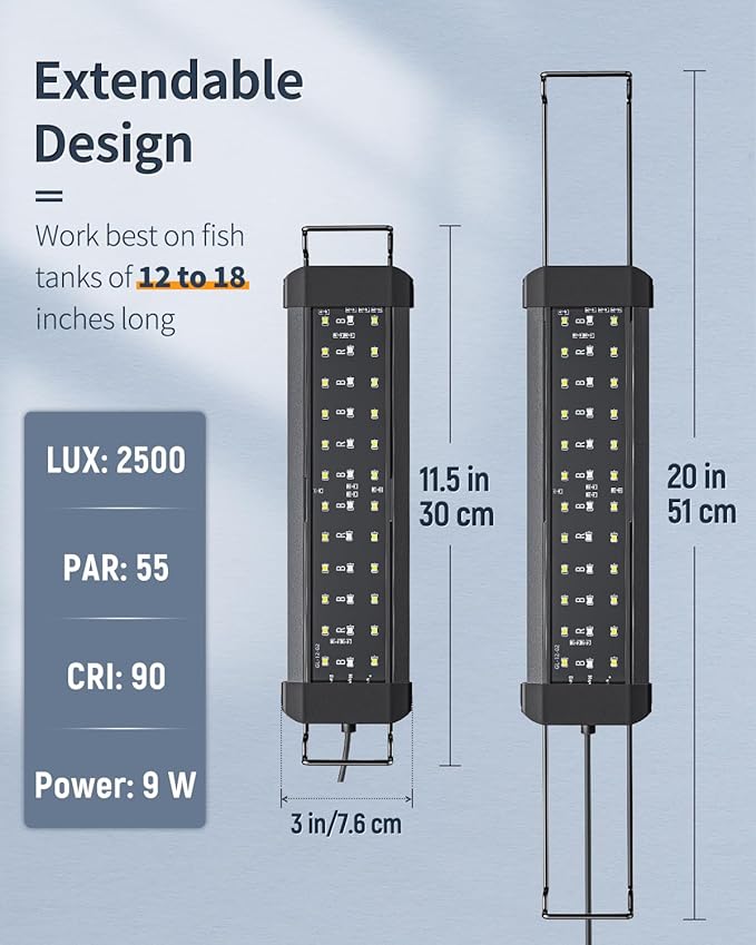 - For 12" to 18" Tanks: With an extendable bracket (min length: up to 11.5"; max length: up to 20"), the LED aquarium light always stays steady on the fish tank. Work best on tanks of 12 to 18 inches long.