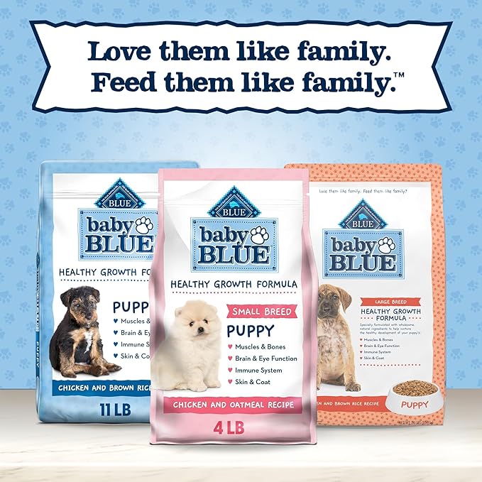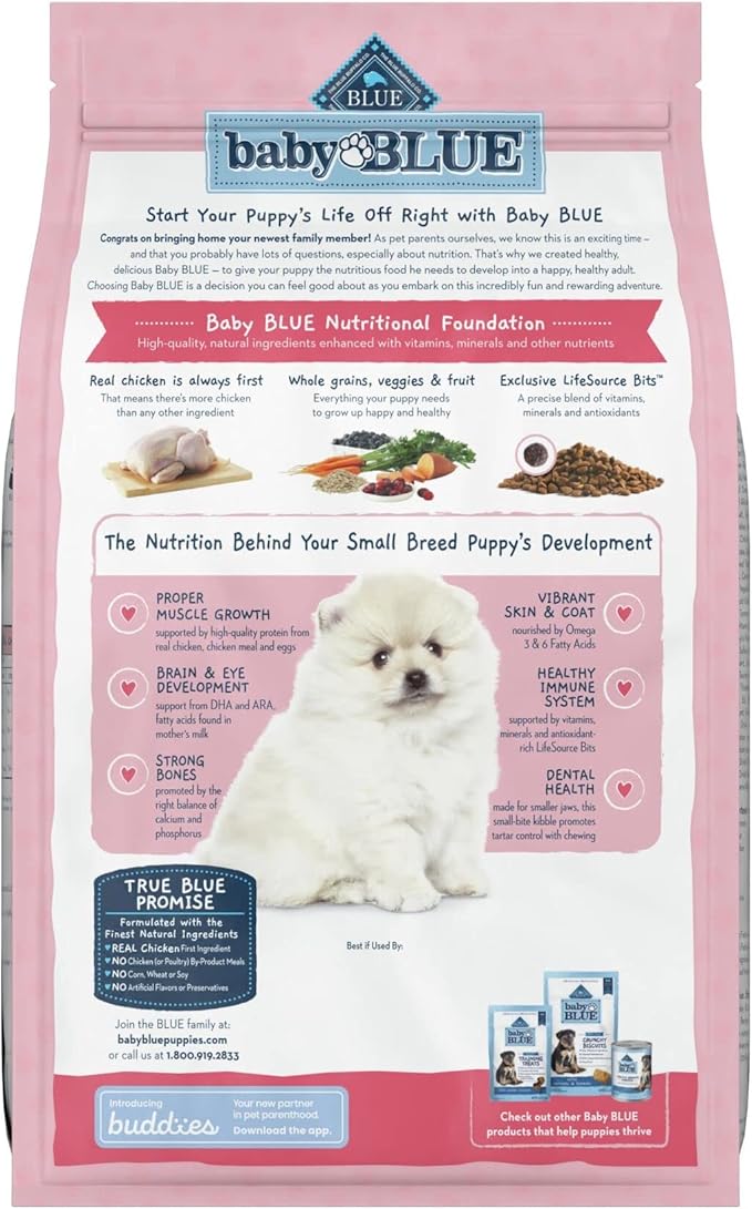 - Contains: One (1) 4-lb. bag of Baby BLUE Healthy Growth Small Breed Puppy Dry Dog Food, Chicken and Oatmeal Recipe