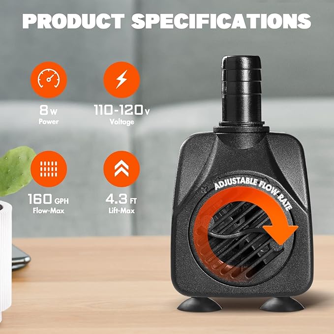 - Powerful Performance: With a 8W motor and 160GPH (600L/H) flow rate, this submersible pump provides efficient water circulation for fish tanks, ponds, aquariums, hydroponic systems, and more.